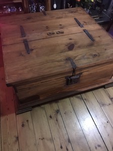 Coffee table in the form of trunk with antique finish.